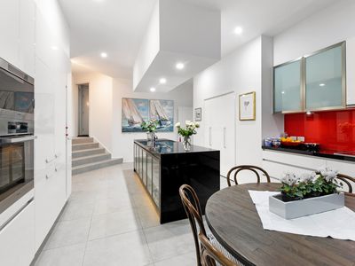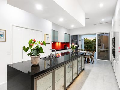 • The large modern kitchen with Miele Appliances opens onto the expansive alfresco deck (made with specially engineered wood to ensure zero maintenance.