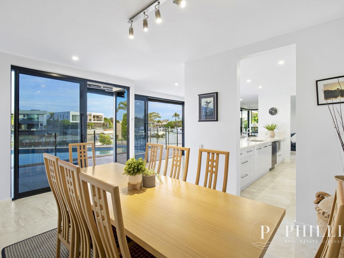 Featuring expansive living areas on both levels, this home offers a unique design that is perfect for entertaining guests, hosting large gatherings, or simply enjoying the company of family and friends. The ground level features a modern and spacious kitchen that opens up to a dining and living area with spectacular views of the water, with large floor to ceiling sliding doors bridging the kitchen and dining spaces to the outdoor pool and entertaining areas surrounded by expansive panoramic views across the canals wide water point position. The upper level is equally as impressive with three bedrooms and an extra living space with views over the pool and waterways.