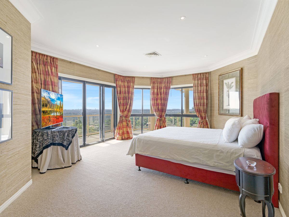 When guests drive up the long, meandering driveway, they will be impressed by the scale of the home, its secluded hilltop location, and, of course, the breathtaking views. Guests can park beneath the covered portico and approach the marble reception lobby through exquisite silky oak double doors.