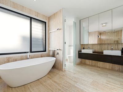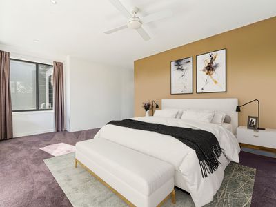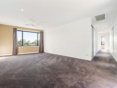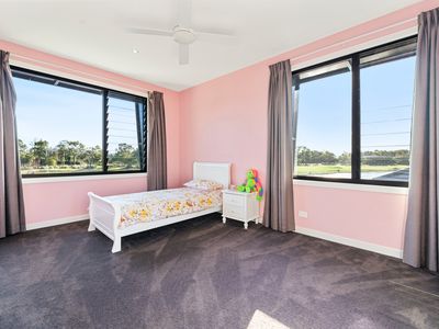 Upstairs, a second living area provides space for a media room, retreat, or children’s play zone. The master suite is a true sanctuary, featuring a walk-in robe and a luxurious ensuite with double vanities, a large shower, and a soaking bath. The remaining bedrooms are all well-sized with built-in robes and ceiling fans.