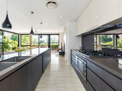 The gourmet kitchen is a chef’s dream, complete with gas cooking, European appliances, and a generous butler’s pantry.