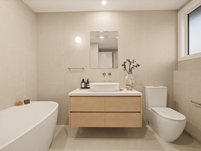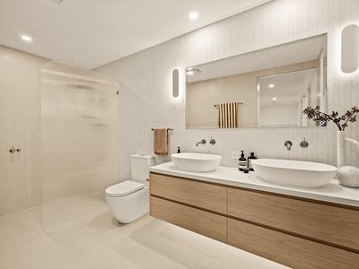 Each area has been thoughtfully composed to reflect refined luxury, with statement floor-to-ceiling tiling, bold gunmetal fixtures, feature lighting, and designer details that add depth and warmth to the bathrooms.