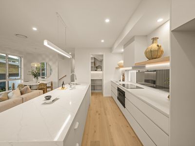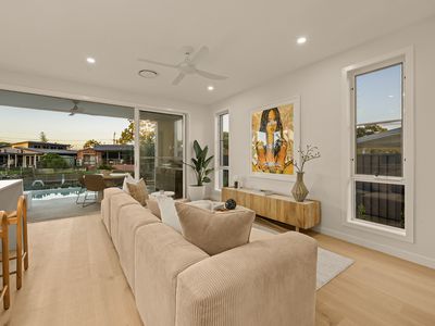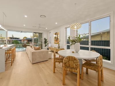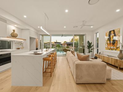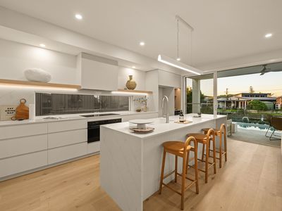 The open-plan kitchen, dining and living space flows effortlessly to a waterfront alfresco entertaining area