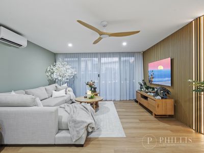 Light-filled living space flowing seamlessly to a private balcony facing North East overlooking the pool.