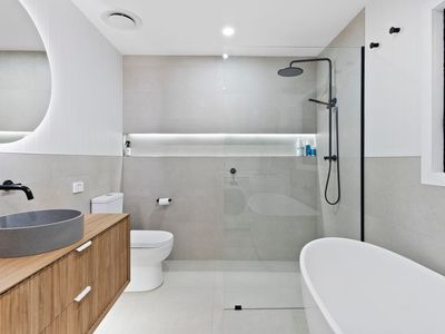 Stylish main bathroom with separate shower and bathtub