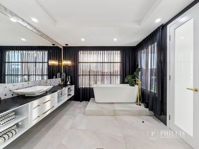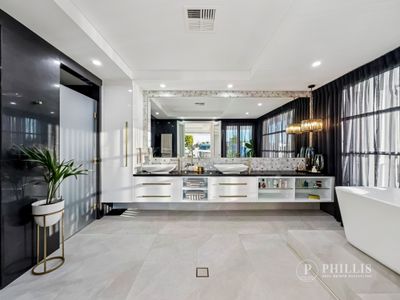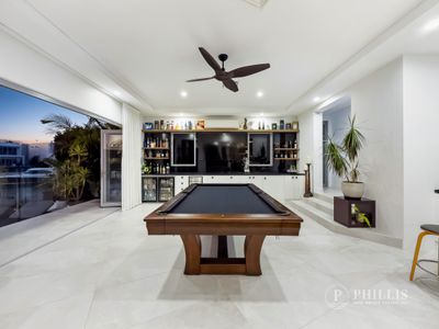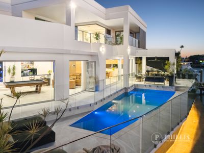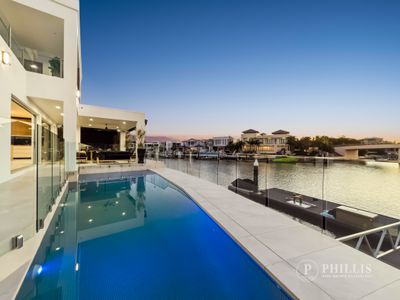 A gated and secured Island estate, similar to Star Island in Miami and the Palms of Dubai. The indoor/outdoor entertainment pavilion is magazine-worthy and sprawls across the waterside, featuring a glamorous kitchen with a butler’s pantry, multiple dining areas, a wet bar and pool table zone, a cinema, and a fireplace lounge room. Ladies, wait until you see the master bedroom with its Hermès shop-inspired walk-in robe!