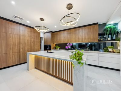 The heart of the home is the state-of-the-art kitchen, crafted for those who love to cook and entertain. It showcases a substantial stone island with curved edges, a full wall of walnut cabinetry, an integrated Liebherr fridge and freezer, and premium Miele appliances including twin wall ovens, induction cooktop, and dishwasher. The butler’s pantry enhances functionality with a Miele coffee machine, convection microwave, Zip tap, and additional fridge/freezer, all supported by a smart-controlled Fujitsu air system.