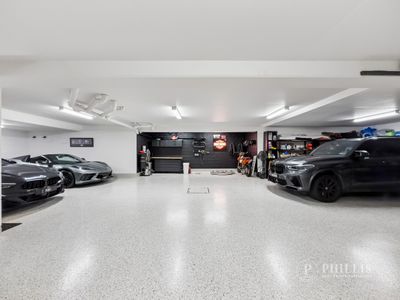The basement level offers epoxy flooring, a multi-car garage for 4–6 vehicles, and additional utility storage.