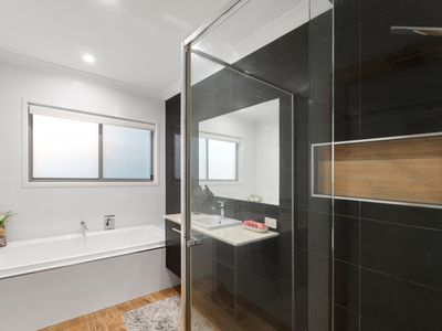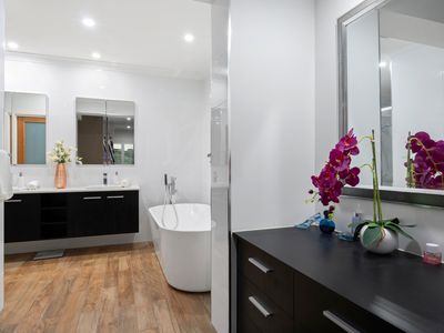 Deluxe ensuite with freestanding bath, double vanity, and premium finishes