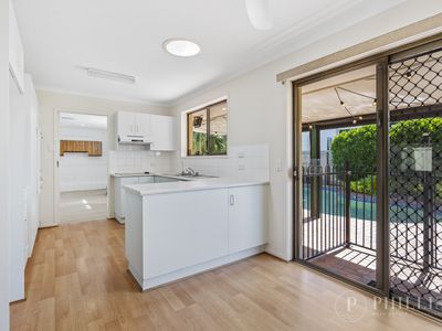 Inside, the home is light and welcoming, with open-plan living and dining areas that flow out to the covered outdoor entertaining space. The family kitchen has plenty of bench and storage space and overlooks the pool — ideal for keeping an eye on the kids.