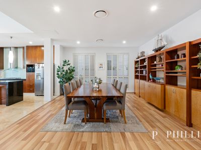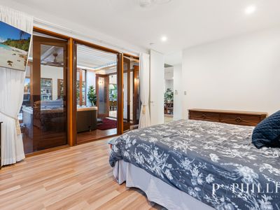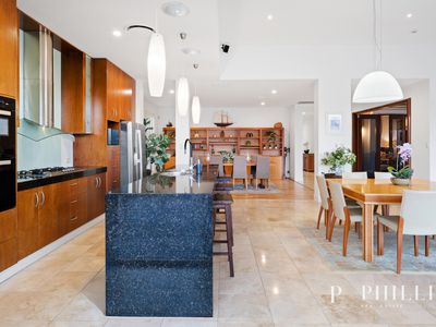 Travertine flooring flows through most living areas, with engineered timber floors in the bedrooms for warmth and comfort. The home is fitted with central, zoned, three-phase air conditioning for year-round climate control.
