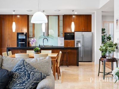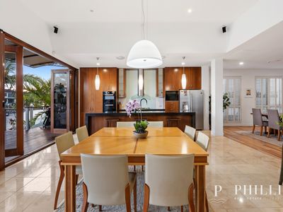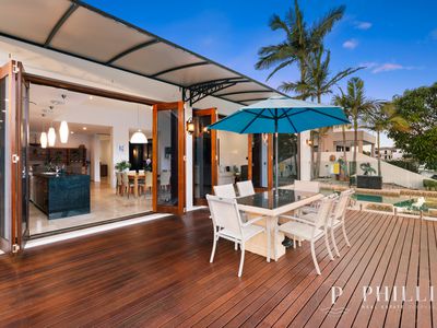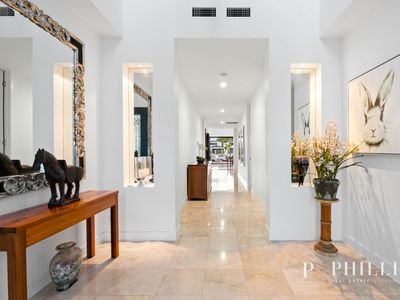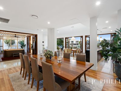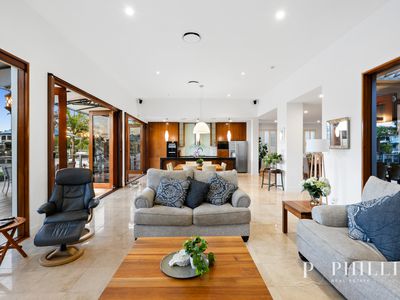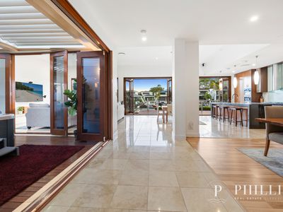 High ceilings, travertine and engineered timber floors, zoned three-phase air conditioning, plantation shutters, and retractable screens create a timeless, breezy elegance that feels Sanctuary Cove-classically.