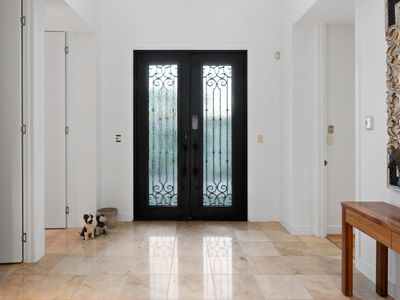 Plantation shutters and retractable screens on many doors and windows allow for excellent airflow while maintaining security and privacy. Secure steel front doors with glass panels complete the entry.