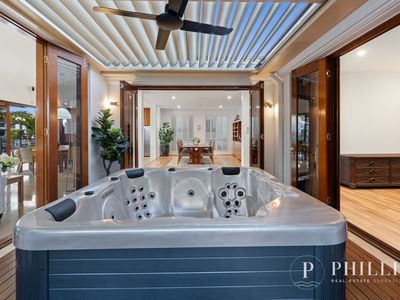 An internal Florida room with a pergola (opening/closing roof) and spa pool (included with the home) provides year-round indoor–outdoor living. There is also a separate plunge pool (approx. 30,000 litres) for cooling off on warmer days.