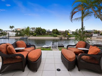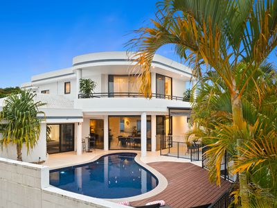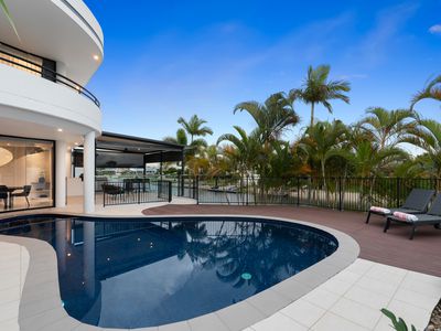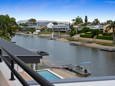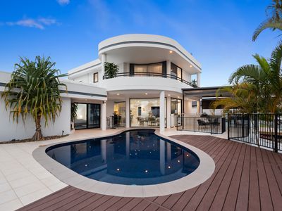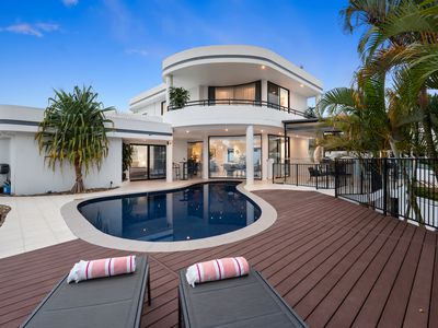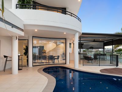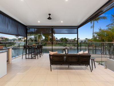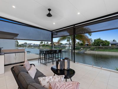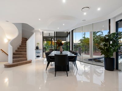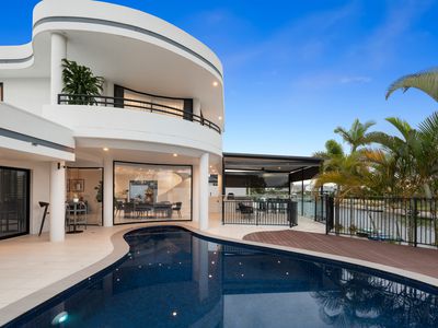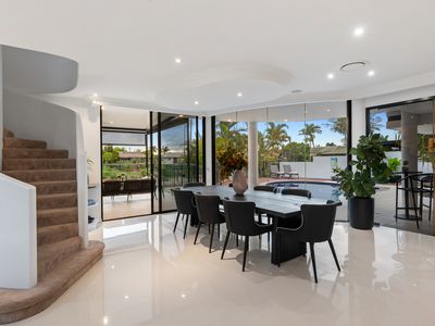 Flowing effortlessly outdoors, the home opens to a spectacular waterfront alfresco zone, centred around an expansive entertaining deck overlooking the pool, spa, and water beyond. Designed for exceptional entertaining, this is a space where long lunches, sunset drinks, and celebrations unfold against a private and tranquil waterfront backdrop.
