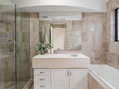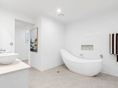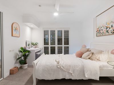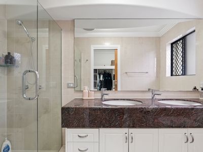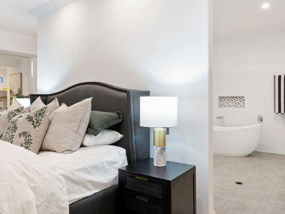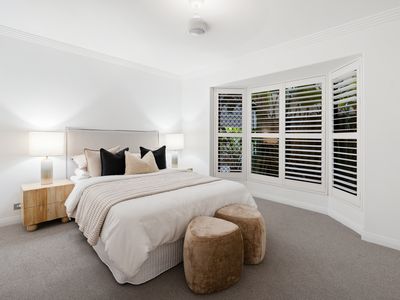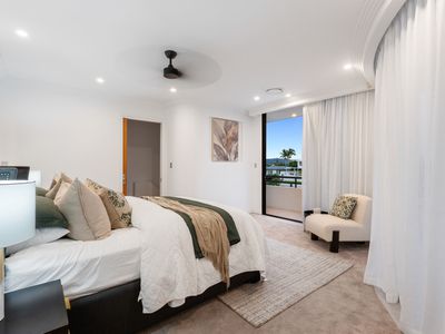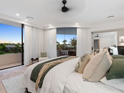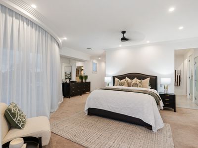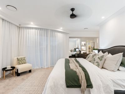 Accommodation is equally impressive, with multiple king and queen sized bedrooms, many featuring ensuites, walk in robes, and access to private courtyards or garden spaces. The master suite is a true retreat, generous in scale with its own living area, study nook, luxurious ensuite with slipper bath and glass enclosed shower, and a private balcony capturing city skyline and hinterland views.