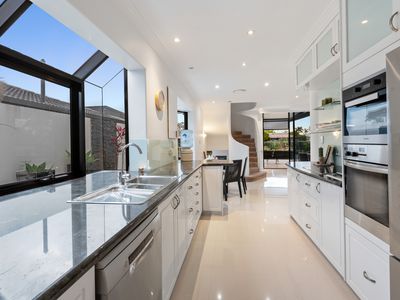 • Designer kitchen with marble benchtops, premium Miele appliances, and hidden galley layout