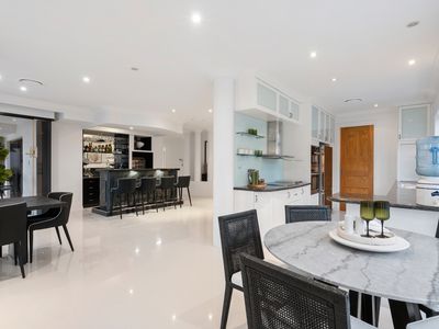 At the heart of the home, a beautifully appointed kitchen is cleverly designed in a hidden galley style, complete with marble benchtops, premium Miele appliances, and extensive cabinetry. A statement indoor marble bar further enhances the home’s entertaining capability, seamlessly supporting both everyday living and gatherings on any scale.