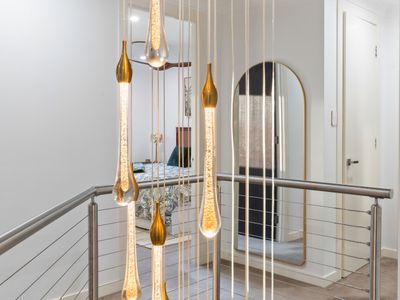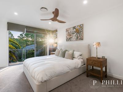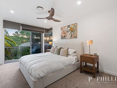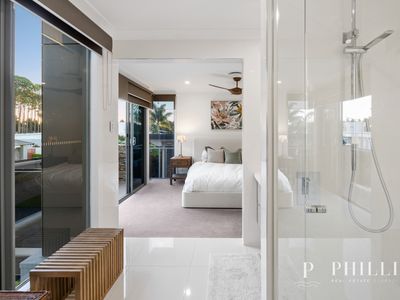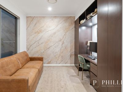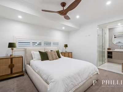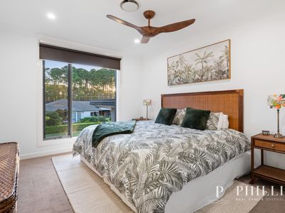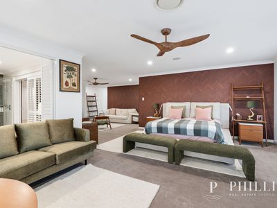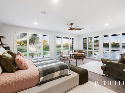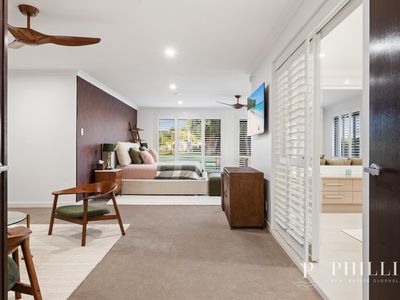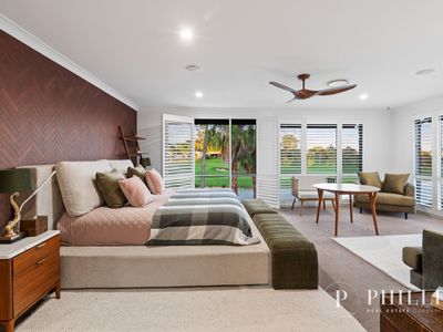 The expansive master suite offers a luxurious private retreat, complete with its own sitting area and sweeping outlook over the fairways. Upstairs, three well-appointed bedrooms are complemented by a spacious lounge or TV area, creating a comfortable and private zone for family living.