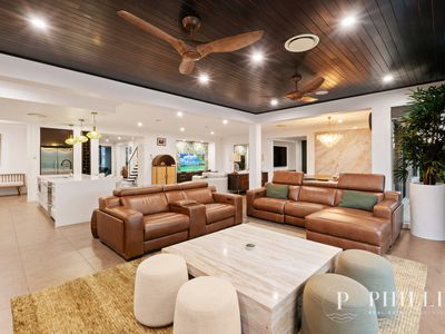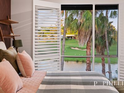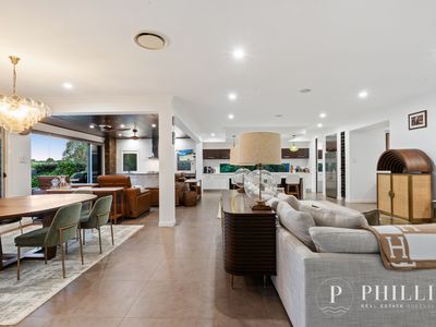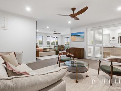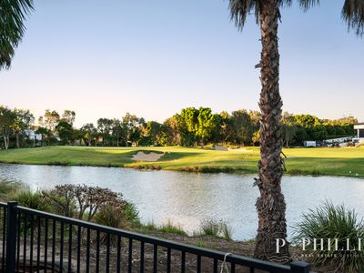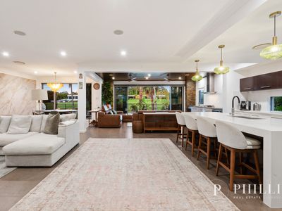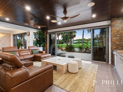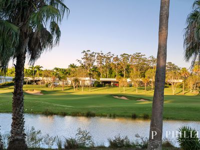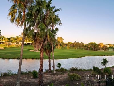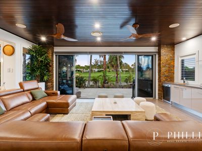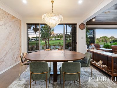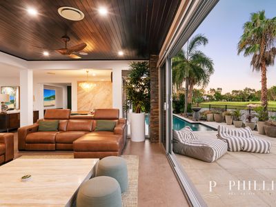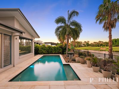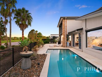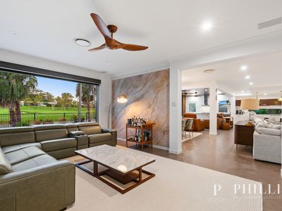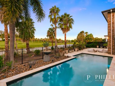 The open-plan living areas are designed to impress, with expansive floor-to-ceiling windows framing uninterrupted views across the pristine 9th Palms Green. Outdoors, the sparkling in-ground swimming pool provides a stunning focal point for relaxation and alfresco entertaining.