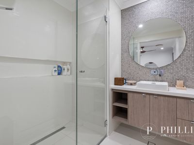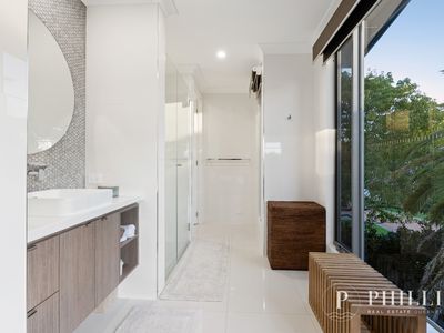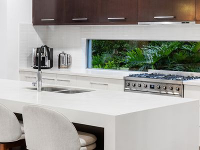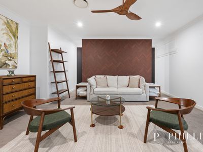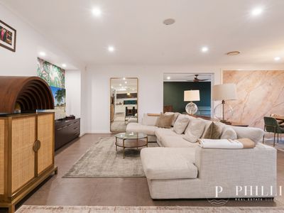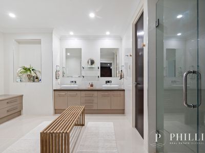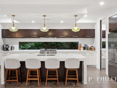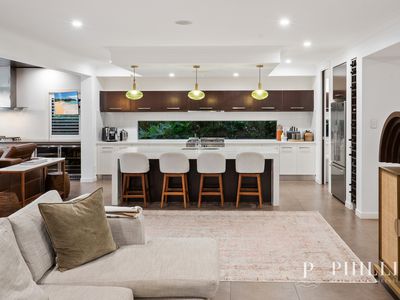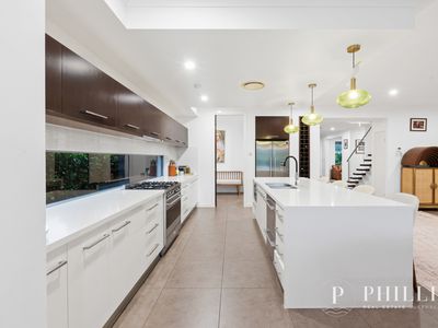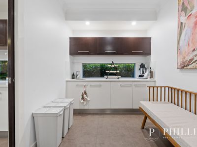 At the heart of the residence is a beautifully appointed kitchen designed for both everyday living and entertaining. It features premium appliances, sleek Caesarstone benchtops and quality soft-close cabinetry. A spacious butler’s pantry adds practicality with extra storage and preparation space, while the large breakfast bar creates a welcoming hub for casual dining and social gatherings.