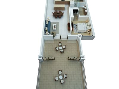 3. The external balcony courtyard area framed with small hedges and tropical plants for outdoor private casual living.