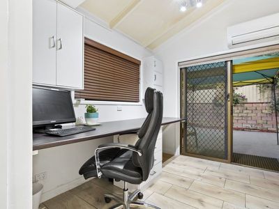 Three good sized bedrooms down the hallway, all with built-ins and ceiling fans The renovated bathroom comes complete with bath & shower and has a separate toilet. At the rear of the home there is a full home office and good sized bedroom with its own access, great guest room or teenage retreat.