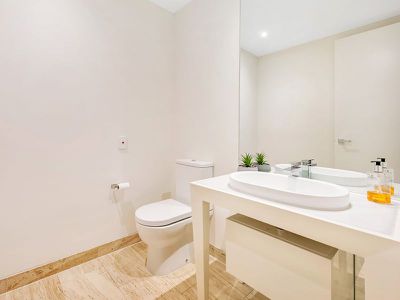 Tiling in the living areas and throughout the bathroom creates a low maintenance and modern feel