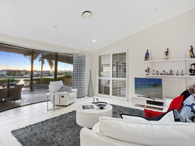 The lounge/dining room is huge and has amazing views over the outdoor living and pool area and then to the wide water with sloping cathedral ceilings which open up the room and looks amazing.