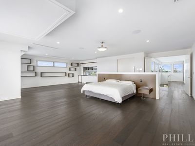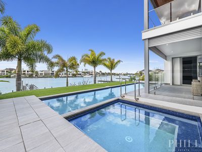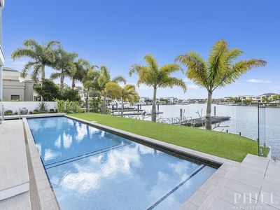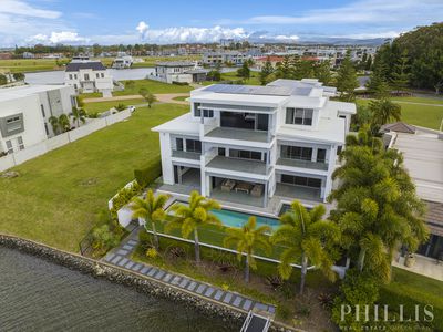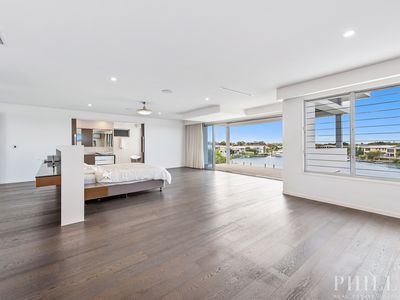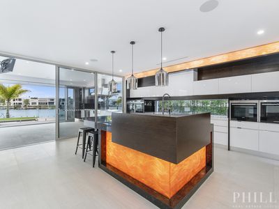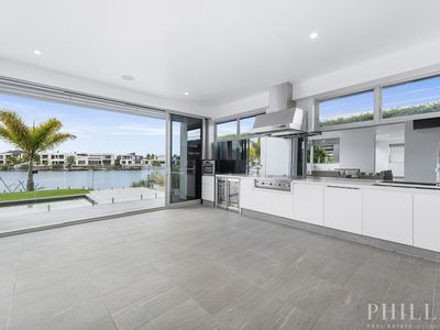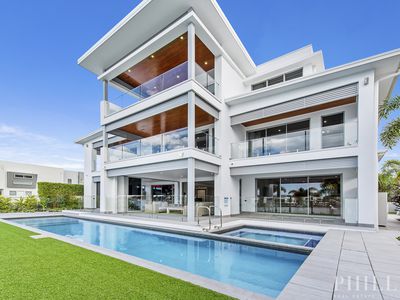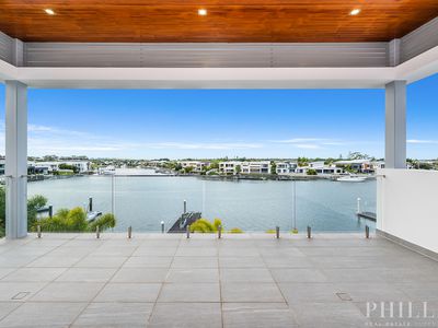 North facing, 4 levels of luxury with a lift, the master bedroom penthouse takes up the whole top-level, 5 ensuited bedrooms on the middle level, zoned security, high-quality concrete construction & the finest finishes, wide & long water views, deep water mooring for a large boat with a 15-metre pontoon, cinema, home office, the Ferrari bar, beer on tap man cave, basement parking for 10 cars, a commercial-grade kitchen with butlers pantry and a cold room, 20 kW solar power system, zoned security system and dial in security system, 24 hour secured estate with rapid response security and paramedics.