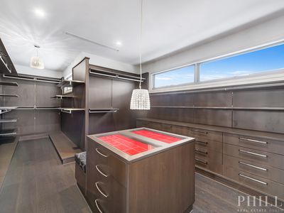 - Walk-in robe with a centrepiece for watches and jewellery, automated lights