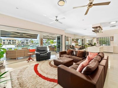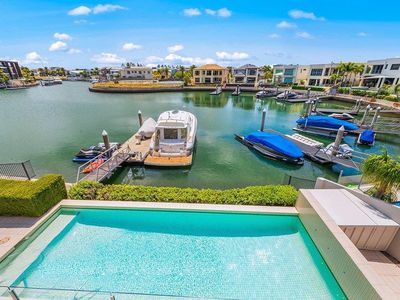 In the heart of the exclusive Sovereign Islands is this spectacular North facing dream home with wide canal views. You are going to love the size and space on offer here with multiple living areas and your own private home theatre. The open plan living/dining/kitchen area make for easy entertaining as the inside areas flow effortlessly out through the bifold doors to the large outdoor entertaining area that looks over the pool and out to the canal.